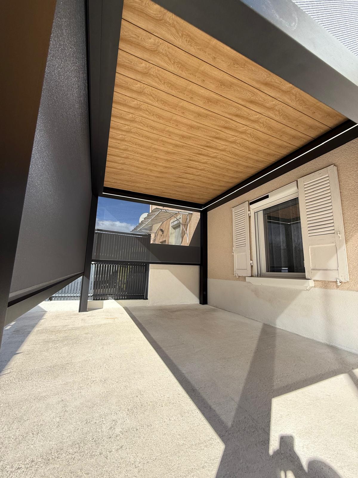 La structure noire apporte une touche contemporaine, tandis que le plafond finition bois réchauffe l’ensemble pour un rendu haut de gamme.
