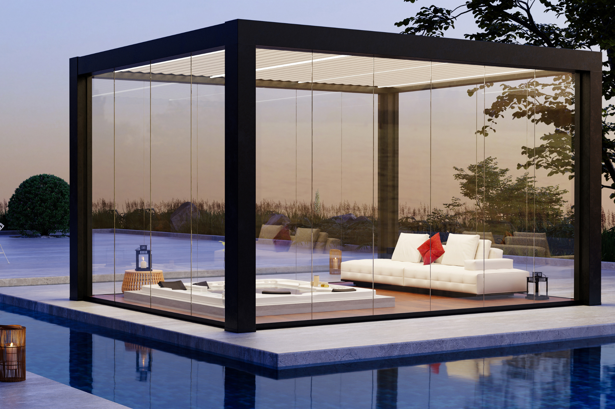 La pergola bioclimatique possède des lames orientables permettant de gérer soleil, ventilation et pluie.