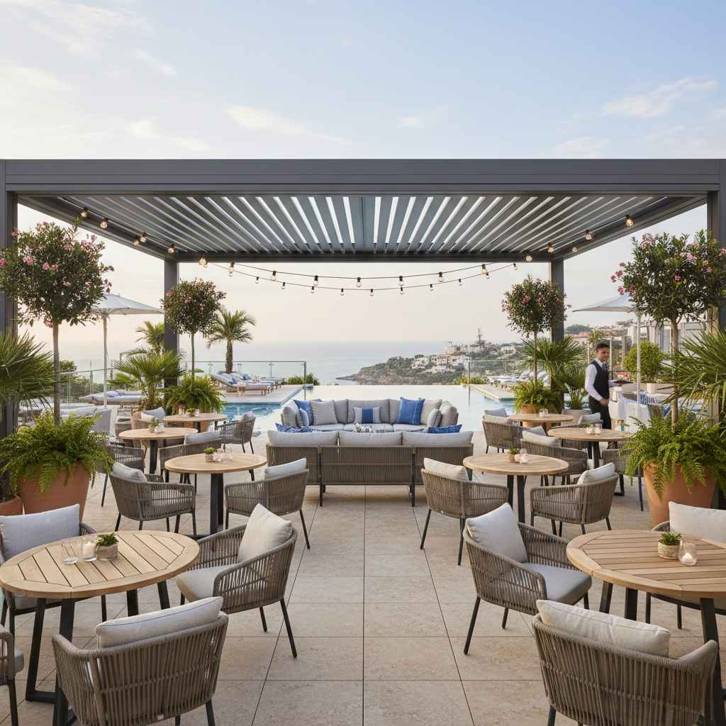Une pergola permet d’augmenter la capacité d’accueil en terrasse, de protéger les clients du soleil et des intempéries et de prolonger la saison d’exploitation. C’est un investissement rentable qui améliore le confort et le chiffre d’affaires.