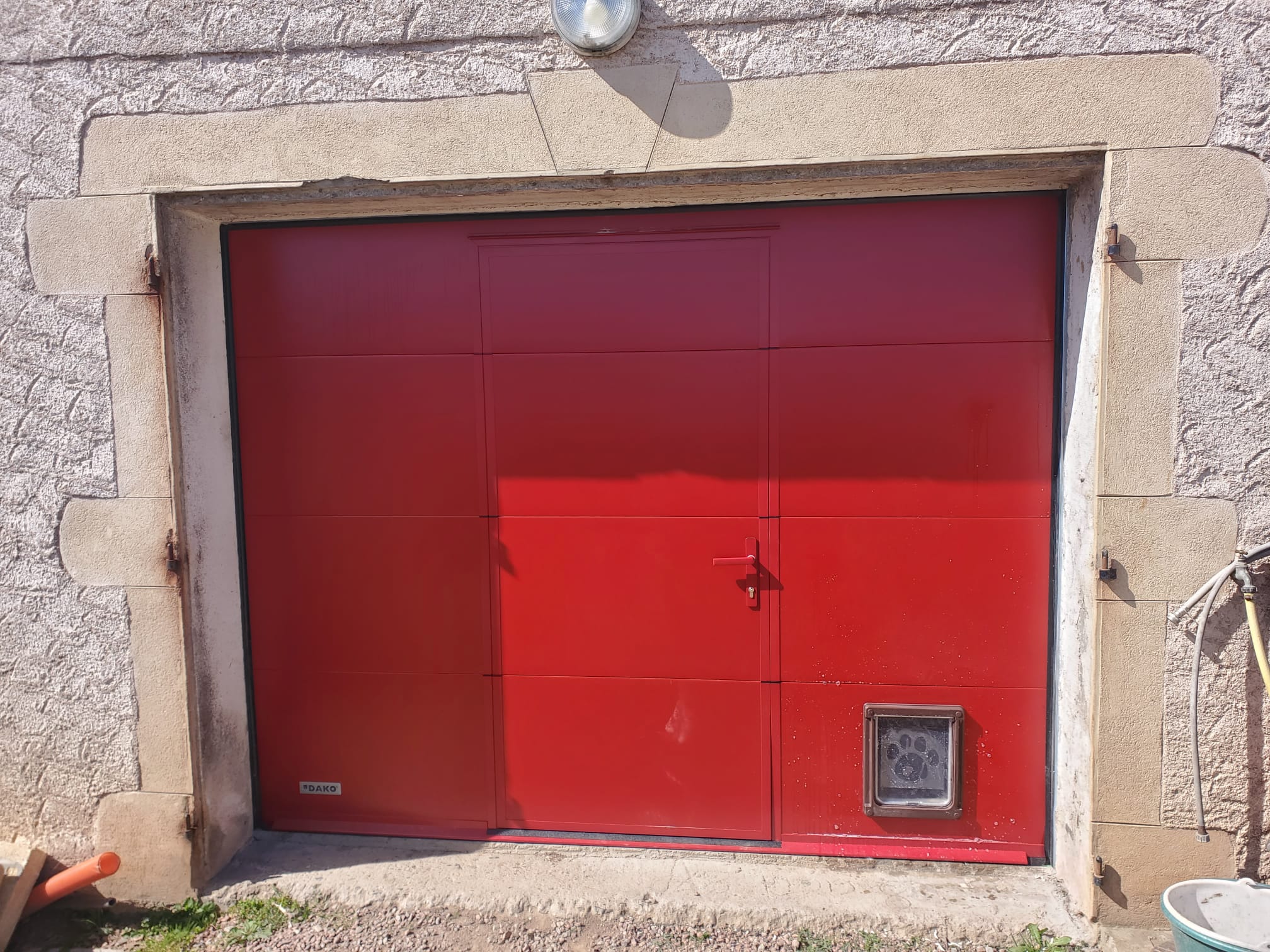 Sur ce chantier réalisé à Saint-Cyr-de-Favières (42), nous avons installé une porte de garage sur mesure intégrant un portillon avec chatière.